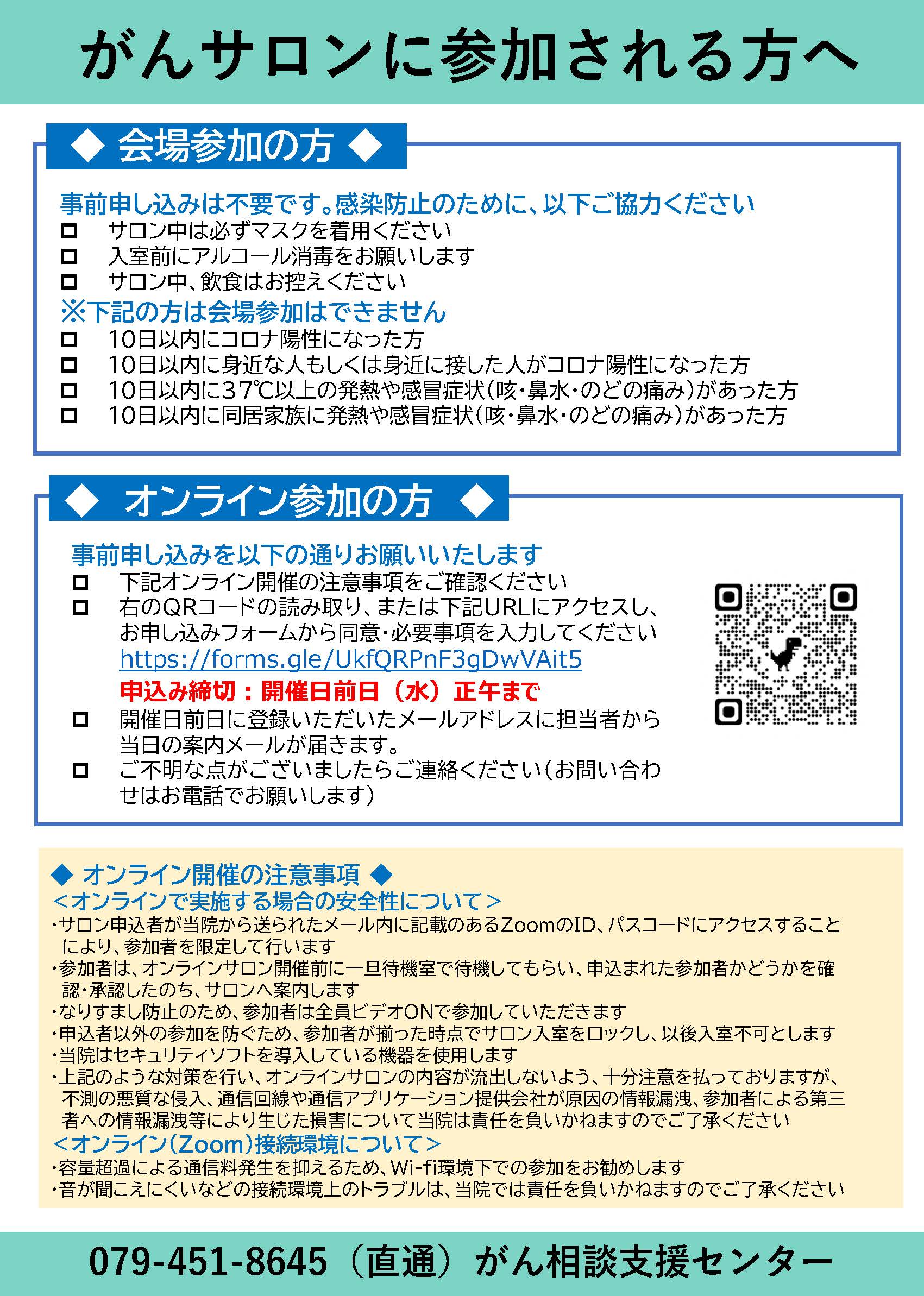 | オンラインで参加の方 | 事前申し込みが必要です※参加方法についてはこちらをご確認ください がんサロン参加者用 ZOOMマニュアル |