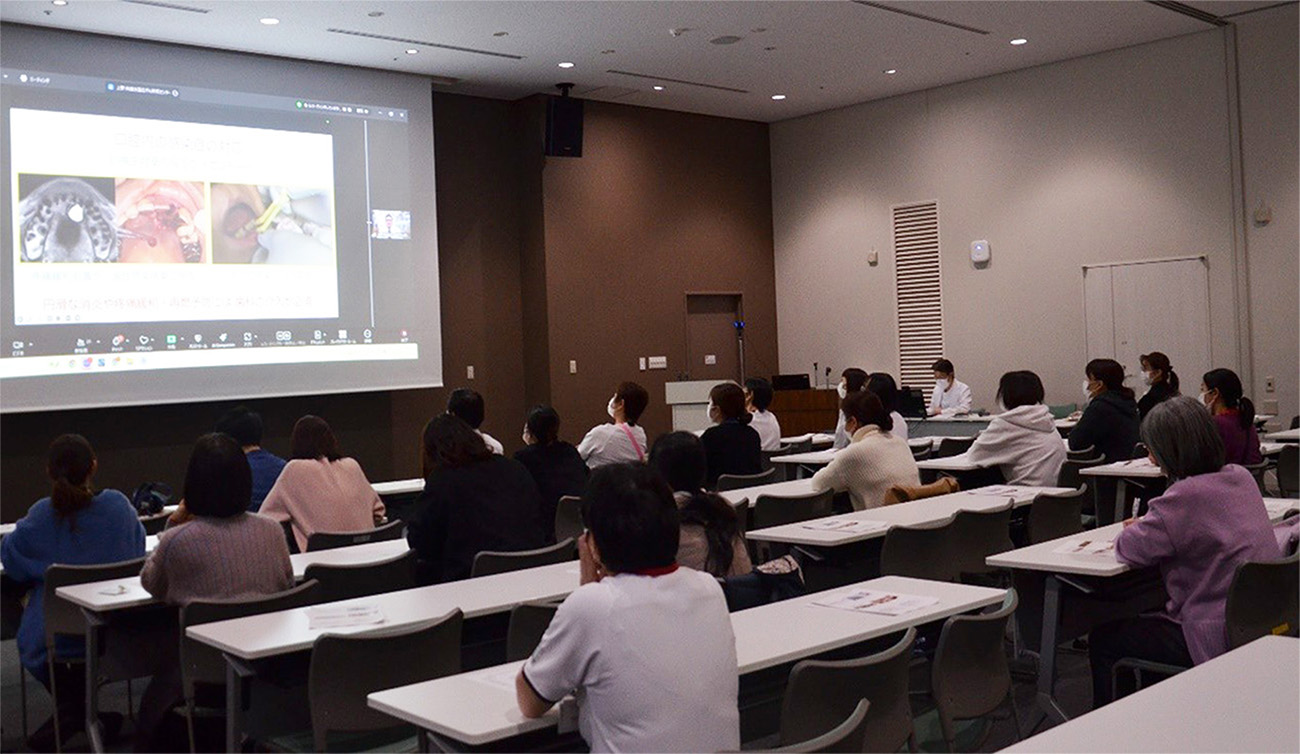 講演では、口腔トラブルの写真や口腔ケアを実践している動画を多数見せていただき、口腔ケアをおこなうためのポイントも教えていただきました。なかでも、「ブラッシング指導はQOLが維持できるために、治療が続けられるために」「口腔ケアは苦痛少なくを第一に、無理に除去しない」「口腔ケアは一気にきれいにするというより、短時間でも頻度を増やす方がいい」など実践に即した内容が印象に残りました。 セミナー終了後のアンケートでも「具体的なケア内容を教えていただけたので、イメージがつきやすかった」「在宅患者さんや抗がん剤使用患者さんで口腔内乾燥を訴える患者さんもおられ、歯科医への受診を勧める知識がついた」「『食べられない』のその裏にドライマウスが潜んでいるかもしれない、という視点でもみていく必要性があると改めて感じた」など多くの感想をいただきました。
