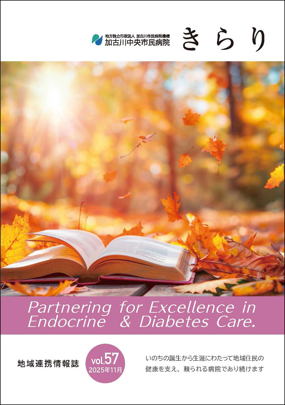 加古川中央市民病院の開院を機に、広報誌の名称を加古川の水面が輝くイメージの「きらり」に変更し、地域連携をより密にするため内容も刷新しました。新病院では、その理念にあるように東播磨地域の医療を支え頼られる病院を目指して職員一同頑張りたいと考えておりますので、どうぞよろしくお願い申し上げます。