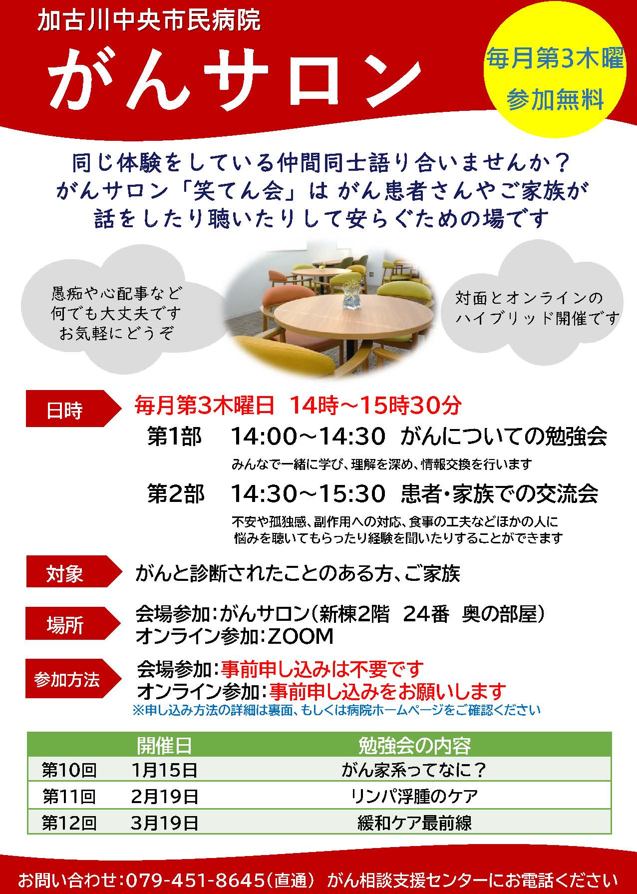 TEL 079-451- 8645(直通) 「がん相談支援センター」にお電話ください