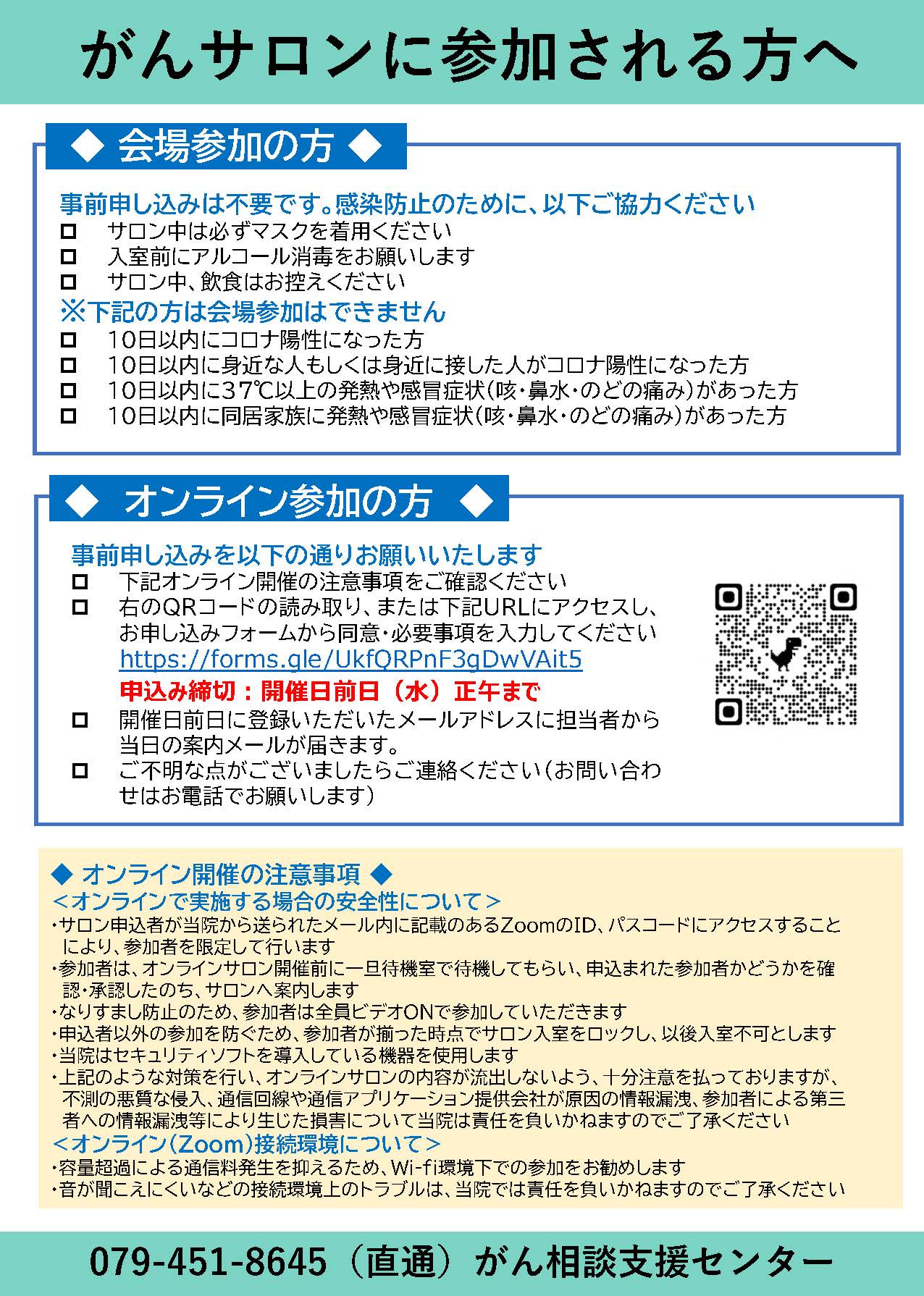 | オンラインで参加の方 | 事前申し込みが必要です※参加方法についてはこちらをご確認ください がんサロン参加者用 ZOOMマニュアル |