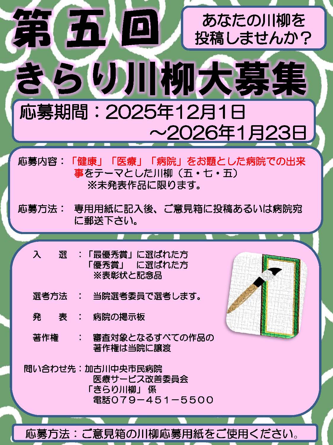 | 郵送先住所 | 〒675−8611 兵庫県加古川市加古川町本町439番地 医療サービス改善委員会「きらり川柳」 係 |