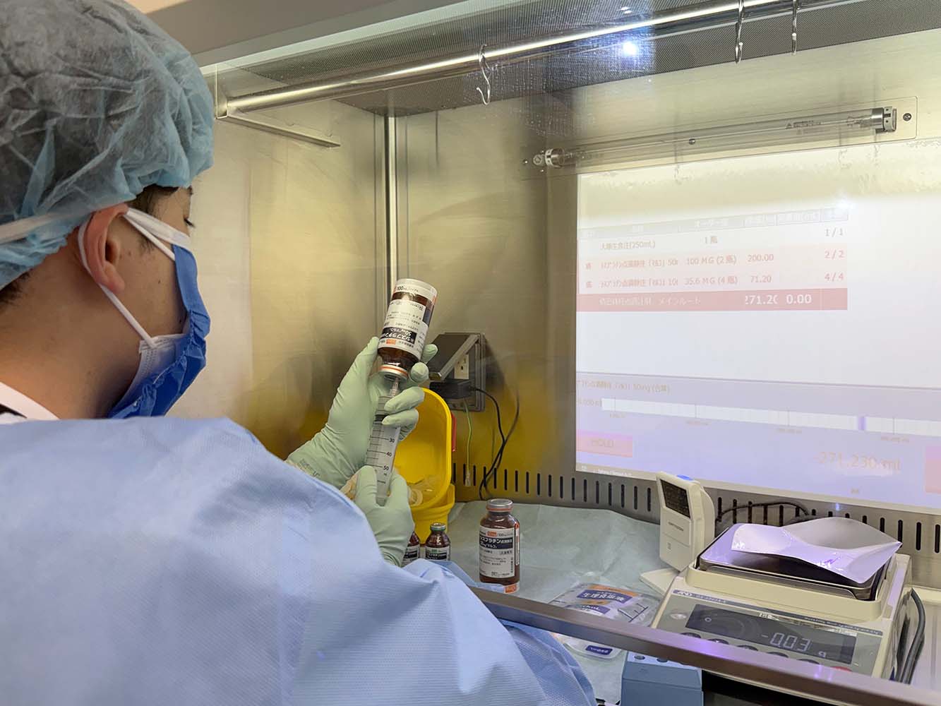 通院治療室では、薬剤師が抗がん薬の投与量や投与方法、休薬期間、臨床検査値などを確認した上で抗がん薬を調製しています。さらに、面談室において治療計画の内容、日常生活での注意点、予想される副作用とその予防法・対処法を丁寧に説明し、患者さんが安心して抗がん薬治療を受けられるよう努めています。