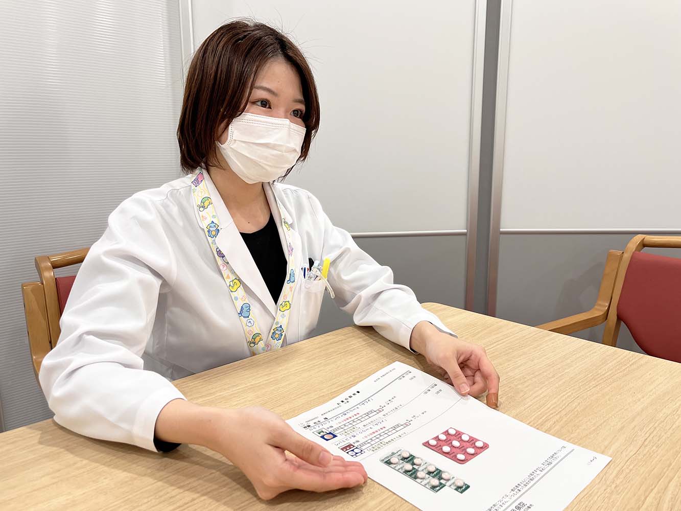 当院では、各病棟に薬剤師を配置し、入退院支援室、通院治療室、薬剤師外来(緩和ケア)にも薬剤師が常駐しています。病棟業務では、服薬説明に加え、薬物治療の効果や副作用の評価、副作用の未然回避を行っています。必要に応じて医師と協議し、処方提案も行っています。