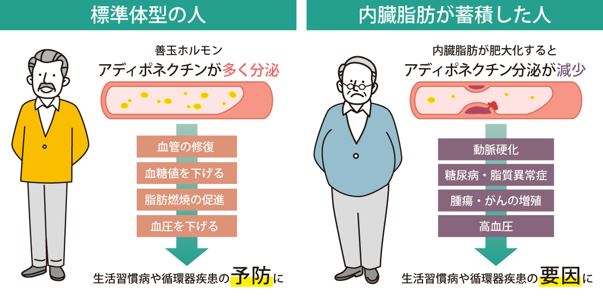 内臓脂肪を構成する脂肪細胞から分泌されるホルモンで長寿ホルモンともいえるたんぱく質。動脈硬化の予防、糖尿病・脂質異常症の改善、がん予防の効果などがあるとされています。