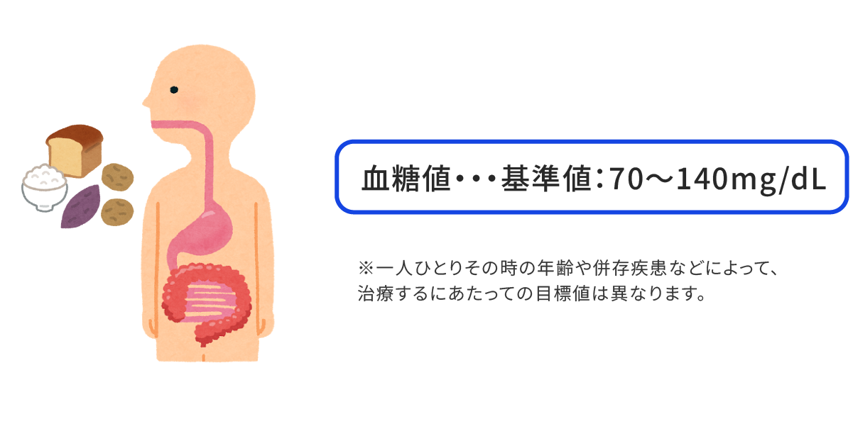 ご飯やパンに含まれる糖質が、おなかの中で消化されブドウ糖になります。ブドウ糖は血液に溶けて血糖となり、全身の細胞に届けられます。生きていくためには最も重要なエネルギー源です。血糖値とは、血液中に含まれるブドウ糖の「濃さ」のことで、高すぎても低すぎてもいけません。