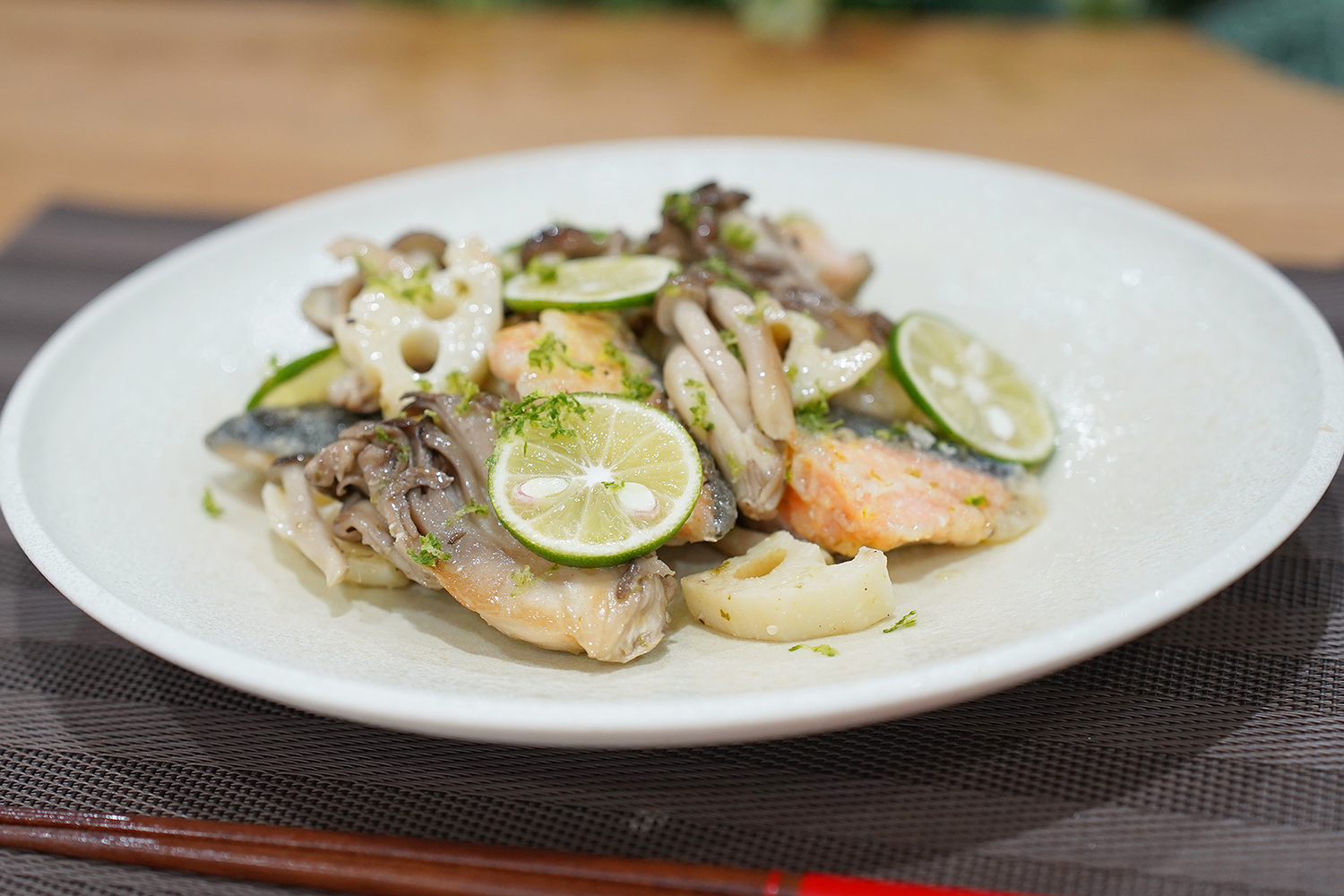 オメガ3脂肪酸や抗酸化物質のアスタキサンチンなど、秋鮭には心血管系の健康をサポートしてくれる栄養素がつまっています。秋の味覚のきのこといっしょに。旬のすだちをスパイスにするので、マリネ液に塩を使わないまろやかな減塩レシピです。