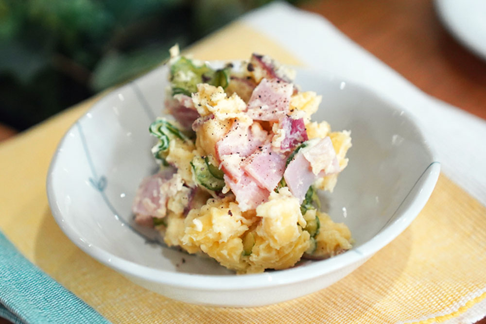 - ➁のきゅうり、食べやすく切ったロースハムを加え、塩こしょうで味を調える。